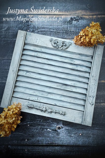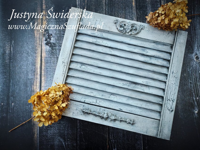 Piszę to żartem, ale zdarza mi się zazdrościć emerytom i bezrobotnym… Pomysły kłębią się w głowie, a czasu na ich realizację mam ostatnio tyle, co kot napłakał… 🙁 Jednak mimo wszystkich przeciwności staram się nie poddawać, bo mam wrażenie, że bez tej kreatywnej odskoczni chyba bym zwariowała 😉 Dlatego wolno, bo wolno, ale jednak dorzucam coś po trochę do mojej Magicznej Szuflady. Dziś praca z cyklu „dwa w jednym”. Z jednej strony panel sam w sobie był projektem, ale z drugiej docelowo ma służyć jako tło do zdjęć dla innych projektów. Dlatego jest dość prosty i oszczędny w formie, bo nie chciałabym, żeby odwracał uwagę od prac, które się razem z nim na zdjęciach pokażą. Lista wykorzystanych produktów jest krótka, ale znalazł się na niej dawno nieużywany przeze mnie spękacz jednoskładnikowy. Dawno po niego nie sięgałam, zamieniając go na delikatne spękania dwuskładnikowe, ale to był dobry pomysł, żeby do niego teraz wrócić. Jeżeli tworzycie projekt, w którym potrzebny jest efekt starego, sfatygowanego drewna z łuszczącą się farbą, to to jest najlepszy wybór.